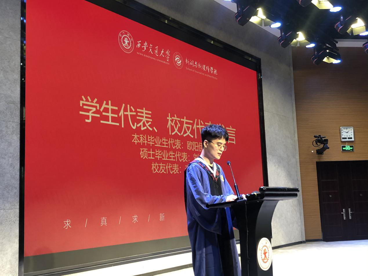 优秀研究生毕业代表刘威从自身经历出发,讲述了努力求学、实现自我的奋斗过程,此时毕业的心情既感激也感动,诚挚感谢了多年为他保驾护航的学校与老师,并感召大家勇往直前,永不言弃,也真诚希望大家分别多年,归来仍是少年。