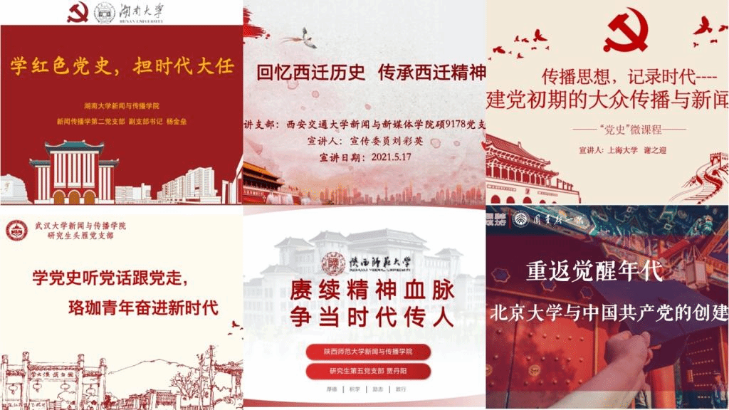 线上学党史活动中,来自5地6校的新闻传播学科党、团支部,在介绍各自支部发展情况基础上,各派出一名宣讲员分别对党史进行不同角度讲解。北京大学新闻与传播学院2020级专硕班党支部书记肖吉雅从热播剧《觉醒年代》切入,将北京大学划为四个时期,分别是新文化运动中心、五四运动策源地、传播马克思主义阵地以及创建共产党重要基地,讲述北京大学与中国共产党创建的历史,带领全体师生重返觉醒年代。武汉大学新闻与传播学院研究生头雁党支部宣传委员任鑫琦分享了当下疫情防控中一个个珞珈青年的动人事迹。湖南大学新闻与传播学院新闻传播学第二党支部副书记杨金垒结合岳麓山红色基因,深挖党史“富矿”。陕西师范大学新闻与传播学院研究生第五党支部书记贾丹阳从“刘泽如”和“杨清源”两位老学长讲起,深刻阐释了“扎根西部、甘于奉献、追求卓越、教育报国”的西部红烛精神。上海大学2020级新闻与传播研究生党支部宣传委员谢之迎,详细列举中国共产党早期创办的4种重要报刊,讲述了建党初期大众传播与新闻的故事。老虎机线上-真钱老虎机-网络老虎机