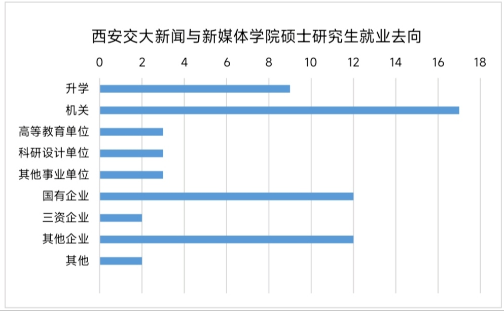 共有63名硕士毕业生。就业去向覆盖升学读博、党政机关、高等教育单位、科研设计单位、其他事业单位、国有企业、三资企业及其他企业,大多数毕业生从事新闻传播相关“对口”专业工作。其中,升学继续攻读博士学位的9人,主要包括中国人民大学、复旦大学、西安交通大学等重点高校,占比高达14.28%,远超我校2022届硕士毕业生国内升学及出国出境留学的总和(6.73%)。在党政机关就业17人,主要包括公务员及选调生,就业省份遍布陕西、江苏、新疆、安徽、福建、四川、湖北、辽宁、山西、甘肃等10个省区,大多在党政机关从事宣传及新媒体传播等工作,占比高达26.98%,再创历史新高。在科研设计单位就业3人,占比4.76%;高等教育单位3人,占比4.76%,主要包括西安交通大学、陕西师范大学等高校,从事辅导员或新闻传播专业教学工作;其他事业单位3人,占比4.76%,主要包括深圳广播电影电视集团、中国教育报刊社等单位。在央企或国有企业就业12人,占比19.04%,主要包括中建八局第一建设有限公司、苏州银行股份有限公司等企业。三资企业2人,占比3.17%;其他企业12人,占比19.04%,主要包括比亚迪汽车有限公司、抖音视界有限公司等知名企业。总体来看,当前各行业对新闻传播专业高层次人才需求依然旺盛,进入机关、其他事业单位、各类企业的该专业毕业生主要负责宣传、品牌策划、品牌形象传播、新媒体运营等工作,专业技能与岗位需求高度匹配。宣传、传播、新媒体等方向工作体现了我院硕士毕业生的就业价值取向和专业能力,也表明新新学子信息筛选处理、表达沟通等软性技能迁移能力强,人岗适配度较高。